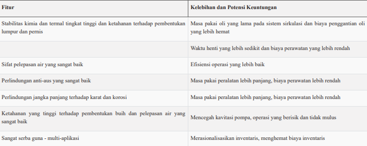aditif yang memberikan stabilitas kimia dan termal yang sangat tinggi, pemisahan air yang cepat dan menyeluruh, dan ketahanan yang tinggi terhadap