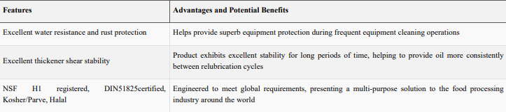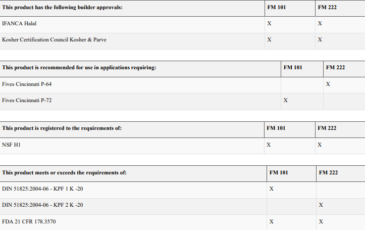 Mobilgrease FM 222 direkomendasikan untuk pelumasan serbaguna pada peralatan pengolahan makanan yang memerlukan pendaftaran NSF H1.