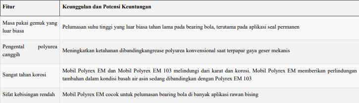 Mobil Polyrex EM dan Mobil Polyrex EM 103 menawarkan fitur dan keuntungan sebagai berikut:
