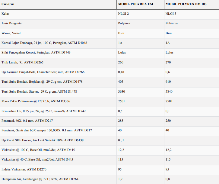 Grease Mobil Polyrex EM direkomendasikan oleh banyak produsen utama bearing dan motor listrik karena pelumasannya yang tahan lama terhadap bearing bola