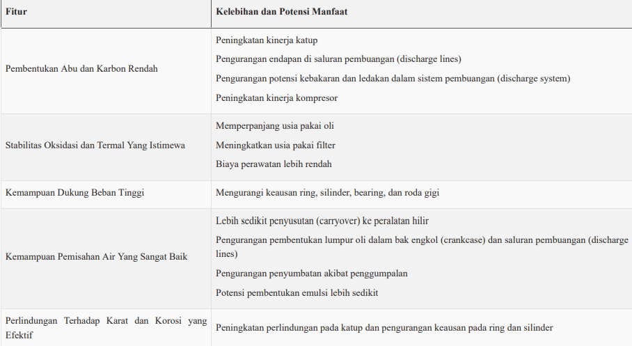 Penggunaan oli Seri Mobil Rarus 400 dapat menghasilkan kompresor yang lebih bersih dan endapan yang lebih sedikit dibandingkan dengan oli mineral konvensional sehingga berujung pada masa pengoperasian yang lebih panjang antara interval pemeliharaan. Stabilitas oksidasi dan termal yang sangat baik memungkinkan usia pakai panjang yang aman seraya mengendalikan pembentukan lumpur oli dan endapan. Seri pelumas ini memiliki perlindungan antiaus dan korosi istimewa yang dapat meningkatkan usia pakai dan performa peralatan.