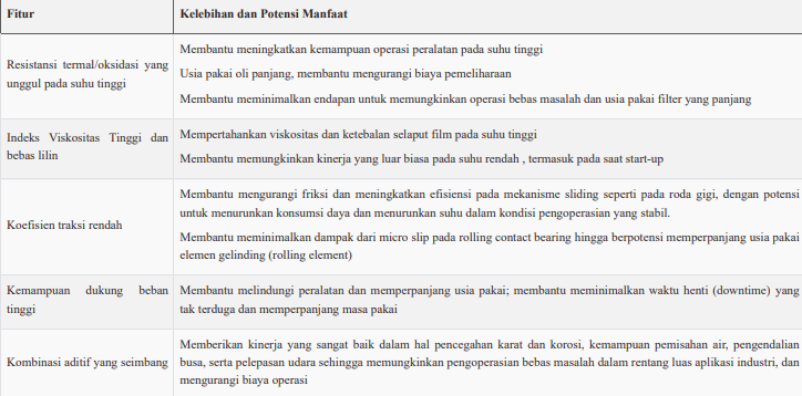 karena potensi resistansi termal/oksidatif yang luar biasa kemudian dikombinasikan dengan sistem aditif yang seimbang, sehingga melengkapi manfaat yang